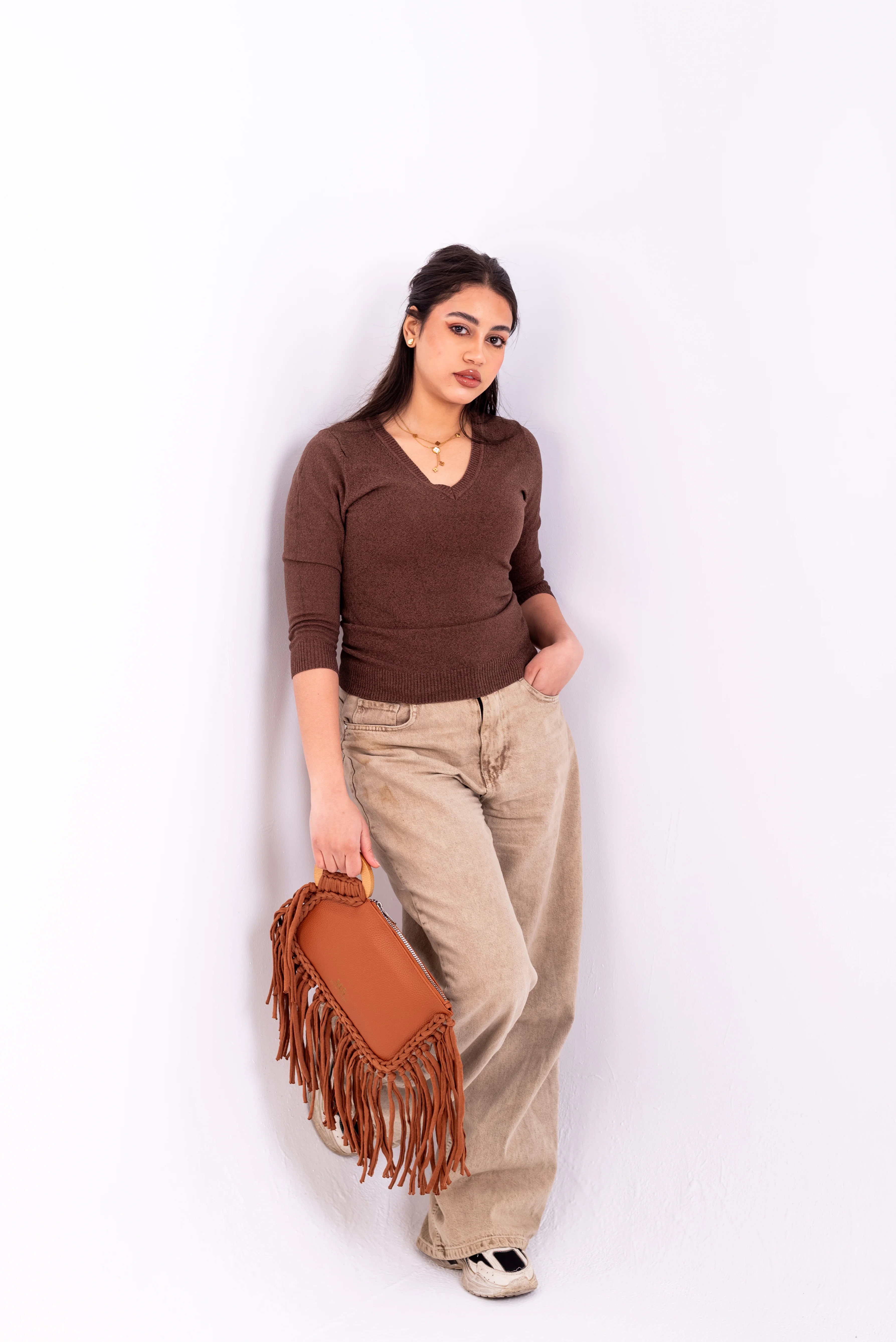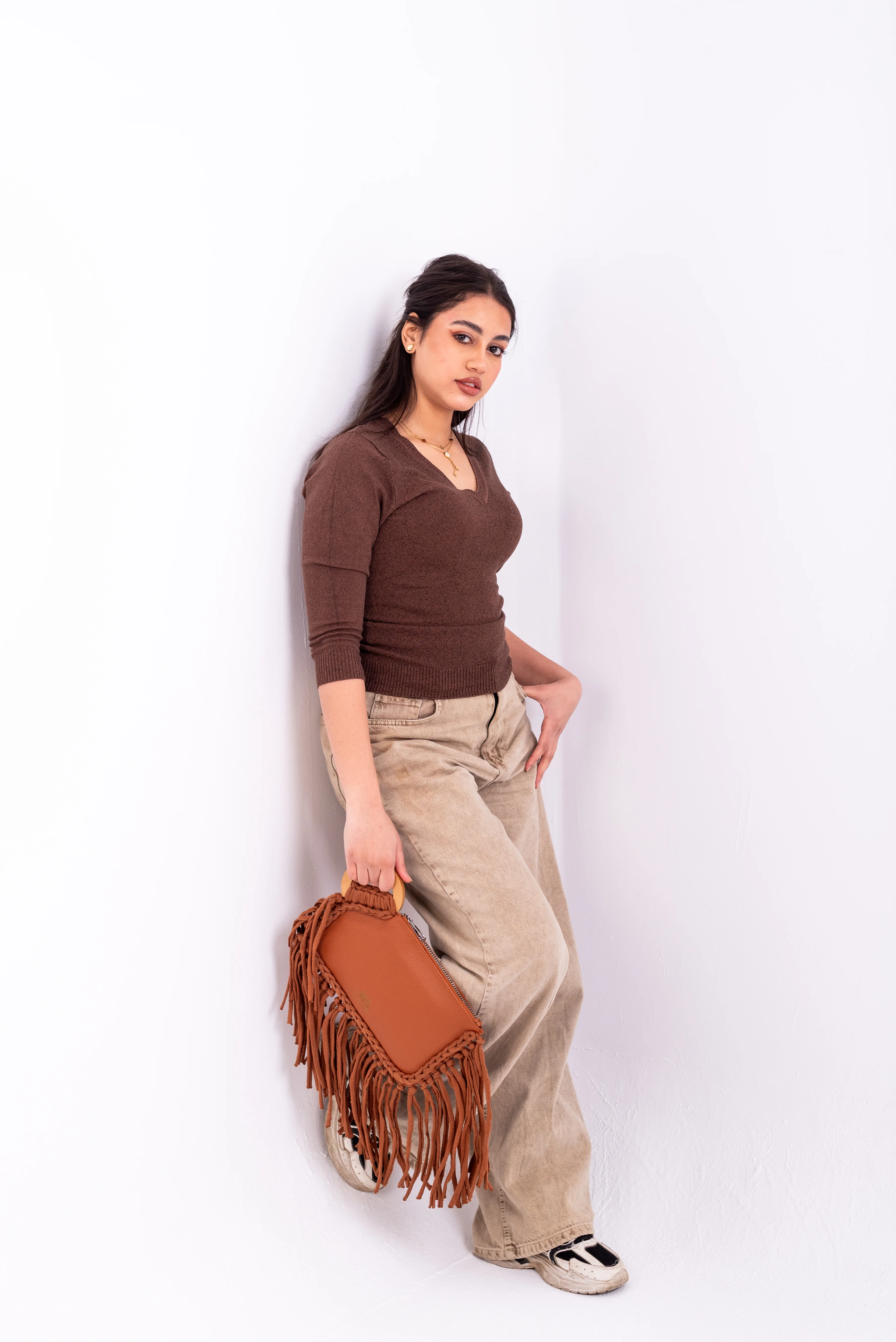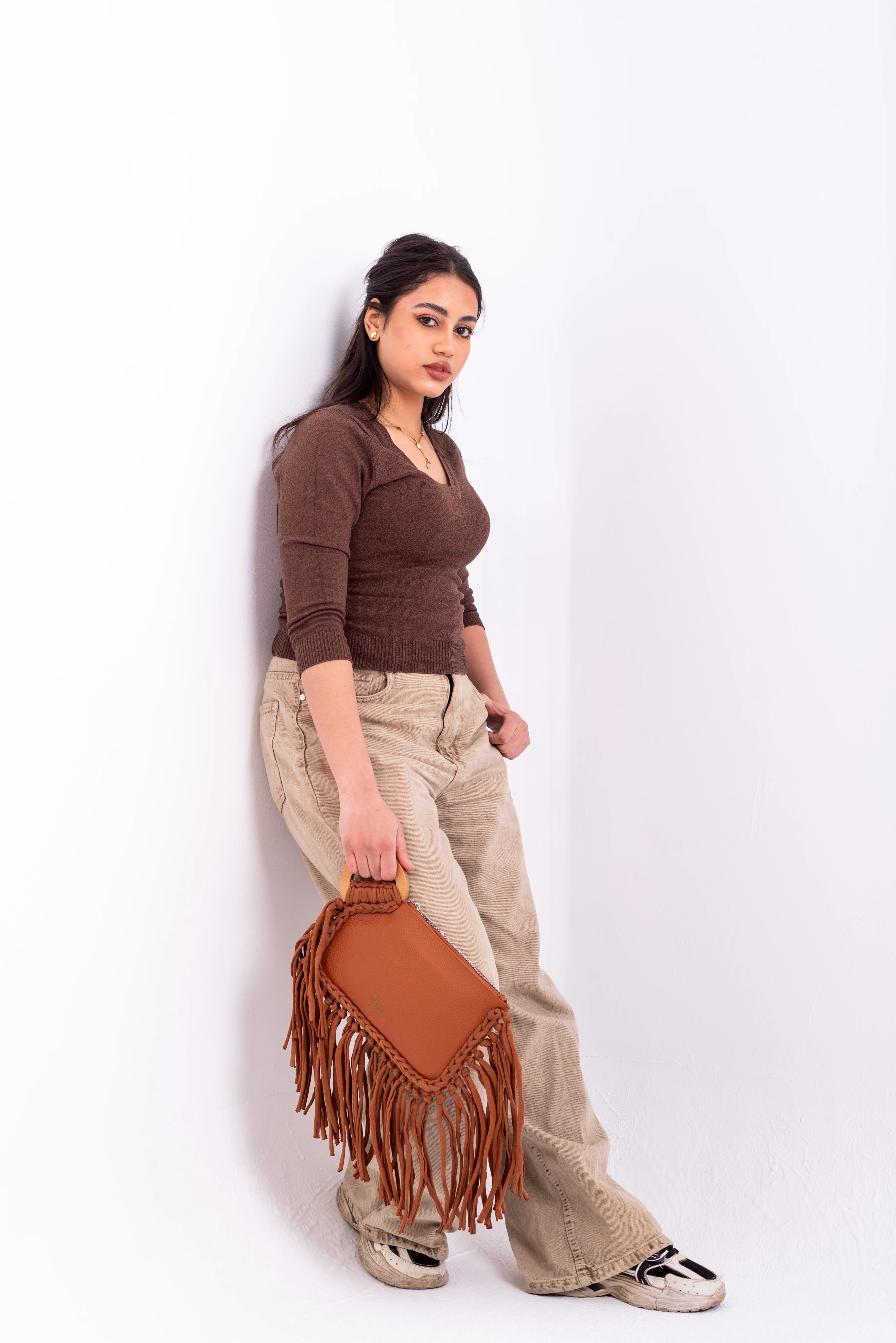 Material: Crafted from a high-quality, pebbled brown material, offering a premium hand-feel and exceptional durability. This material choice ensures your clutch stands the test of time while maintaining its chic appearanc.
