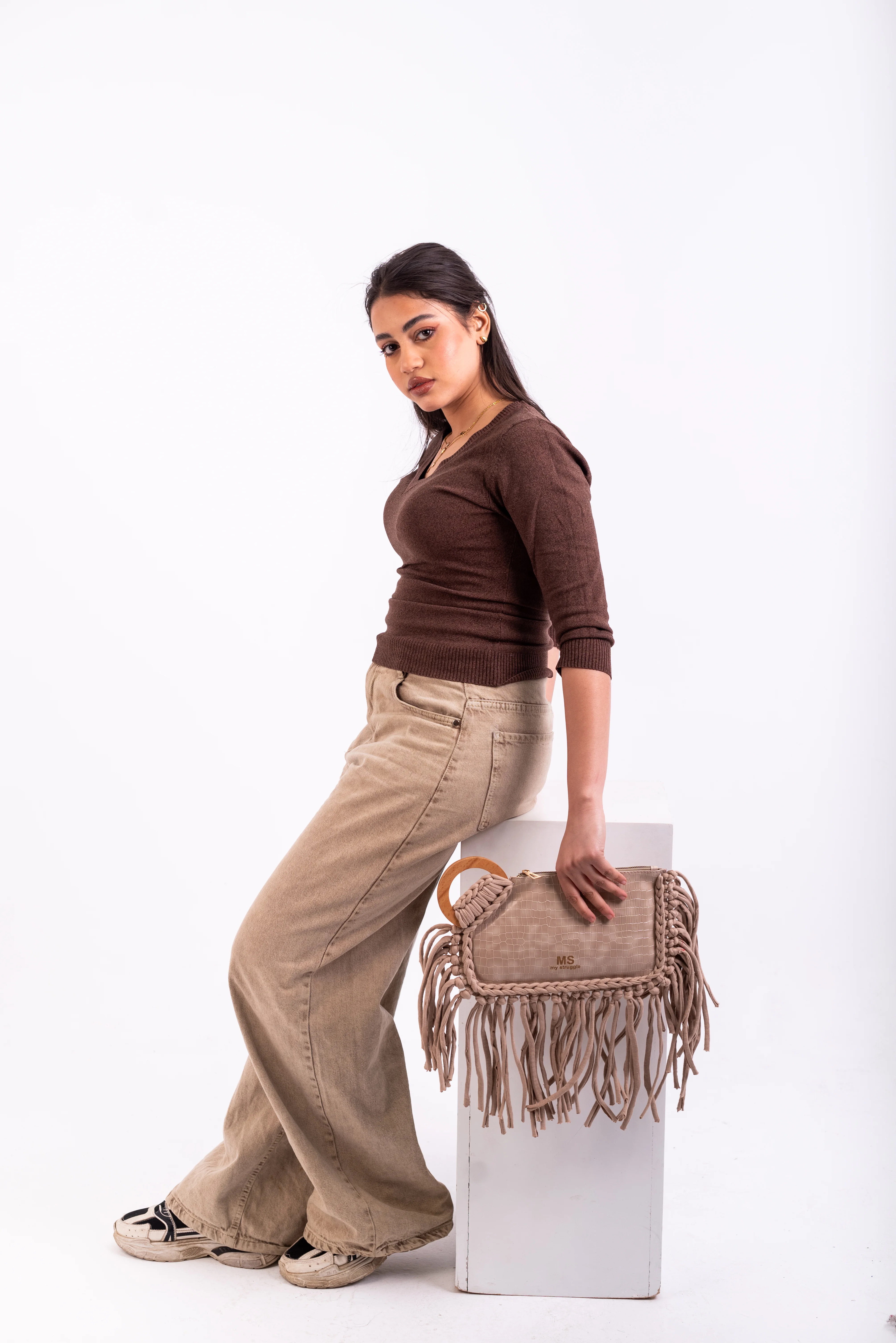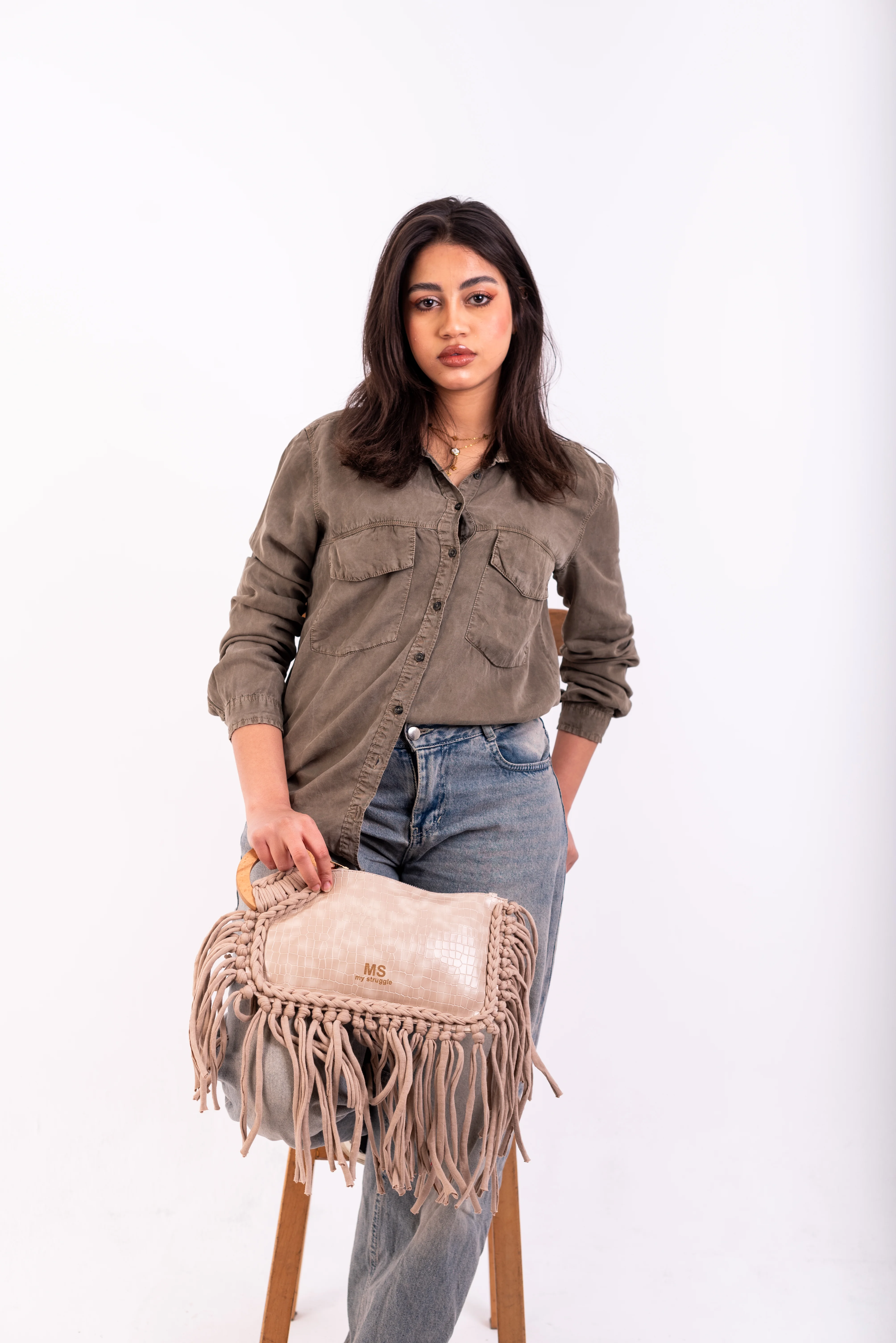 Color: Features a shimmering Metallic Gold hue for both the main body and the distinct, flowing Fringe Detailing, creating a harmonious and glamorous aesthetic.
