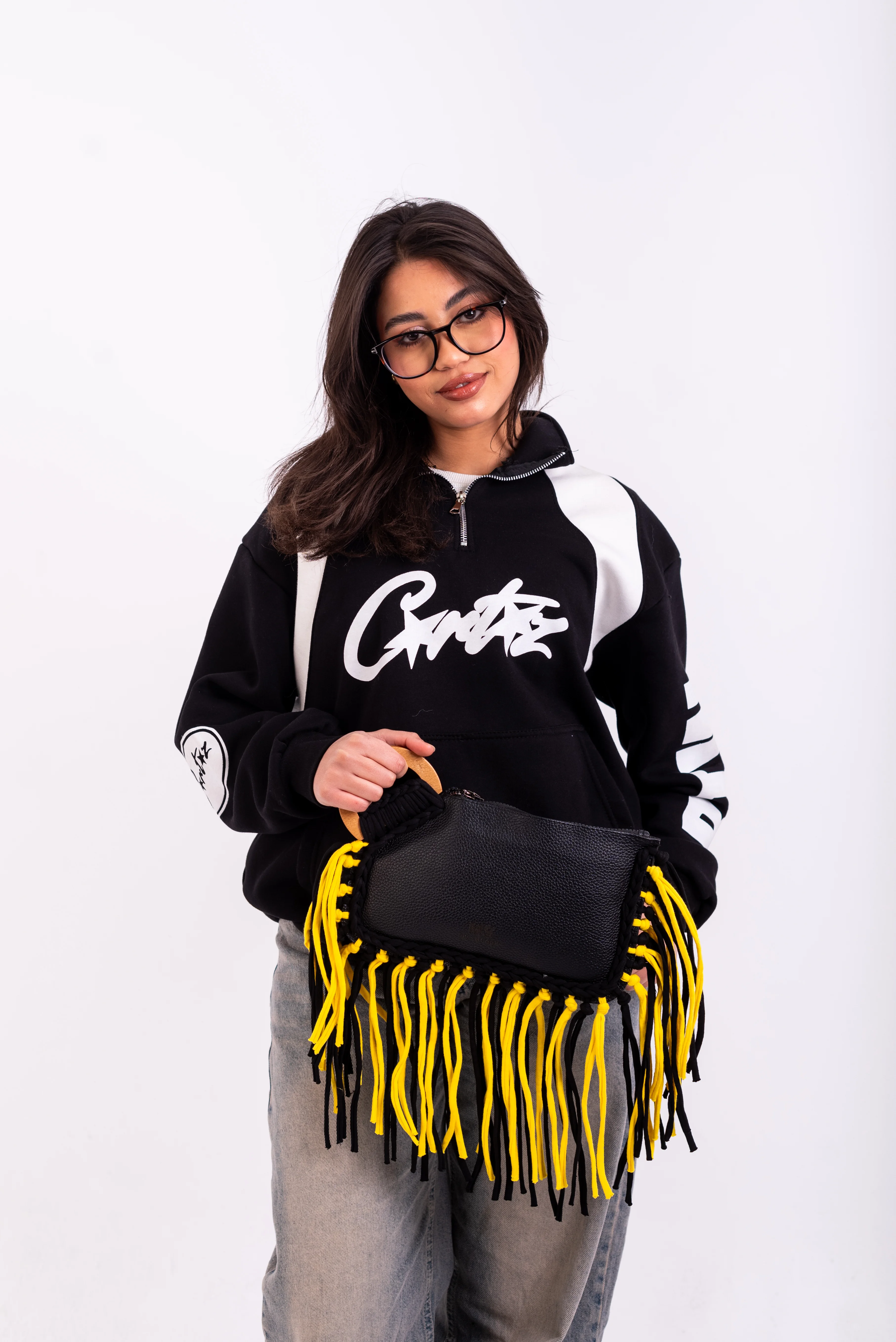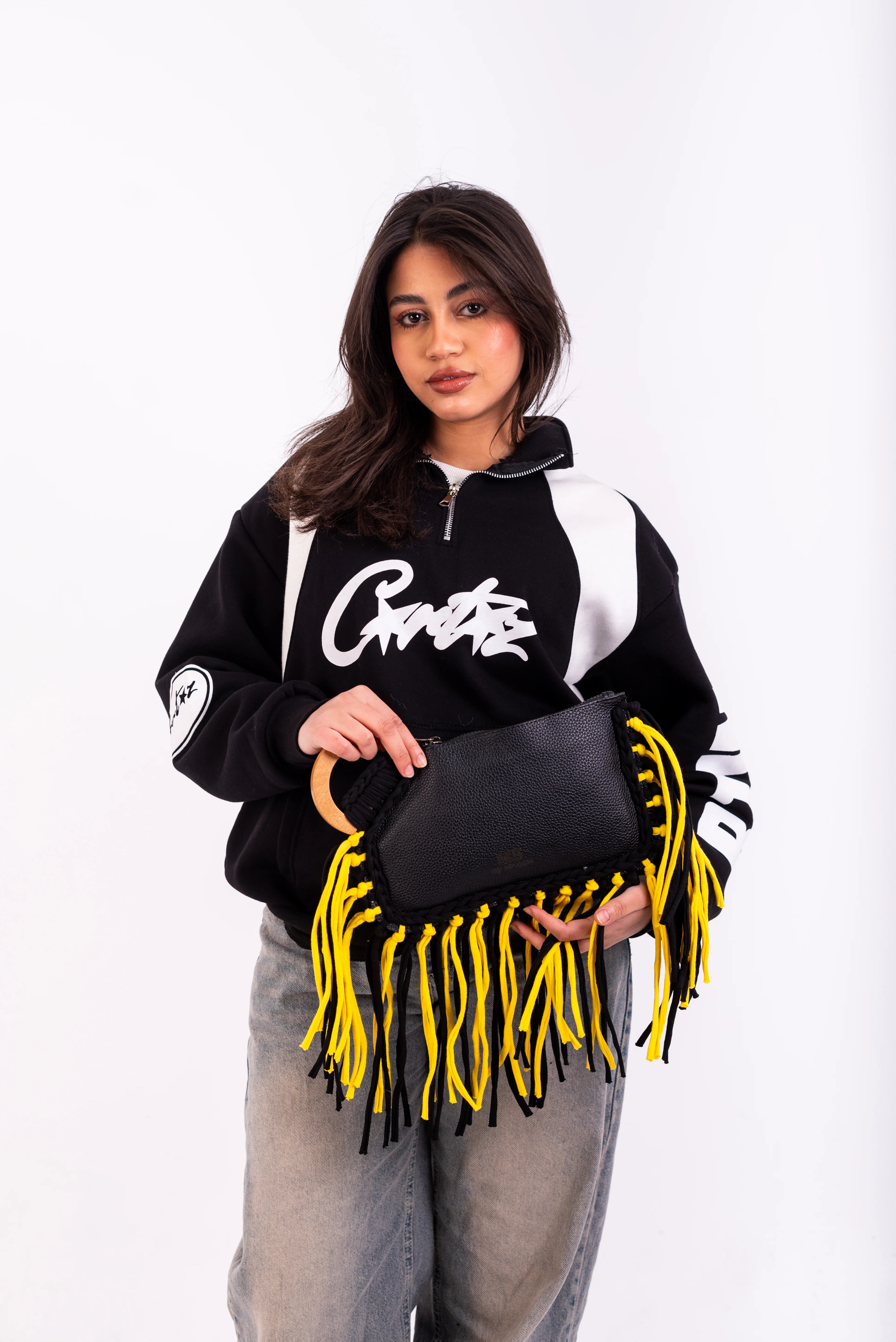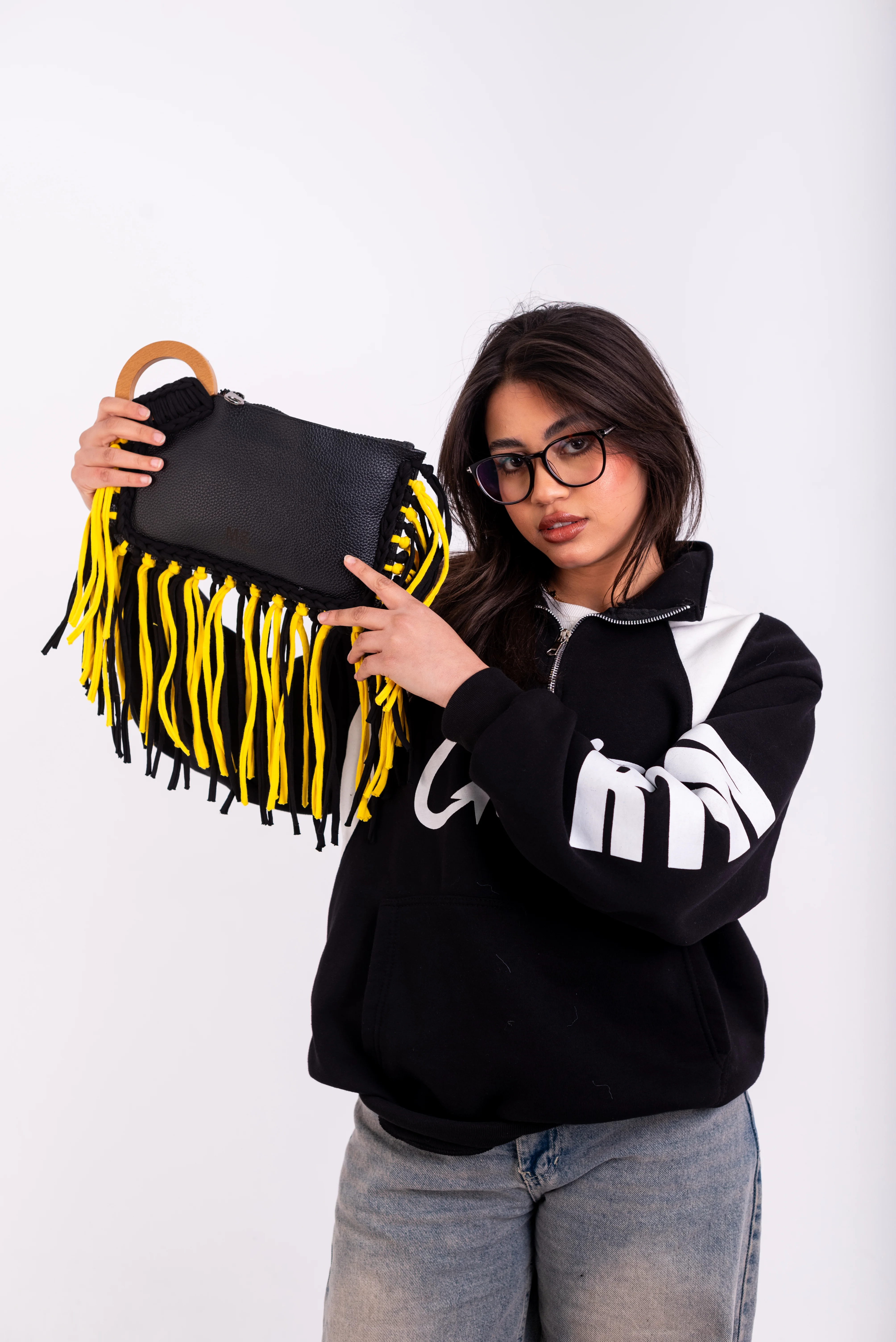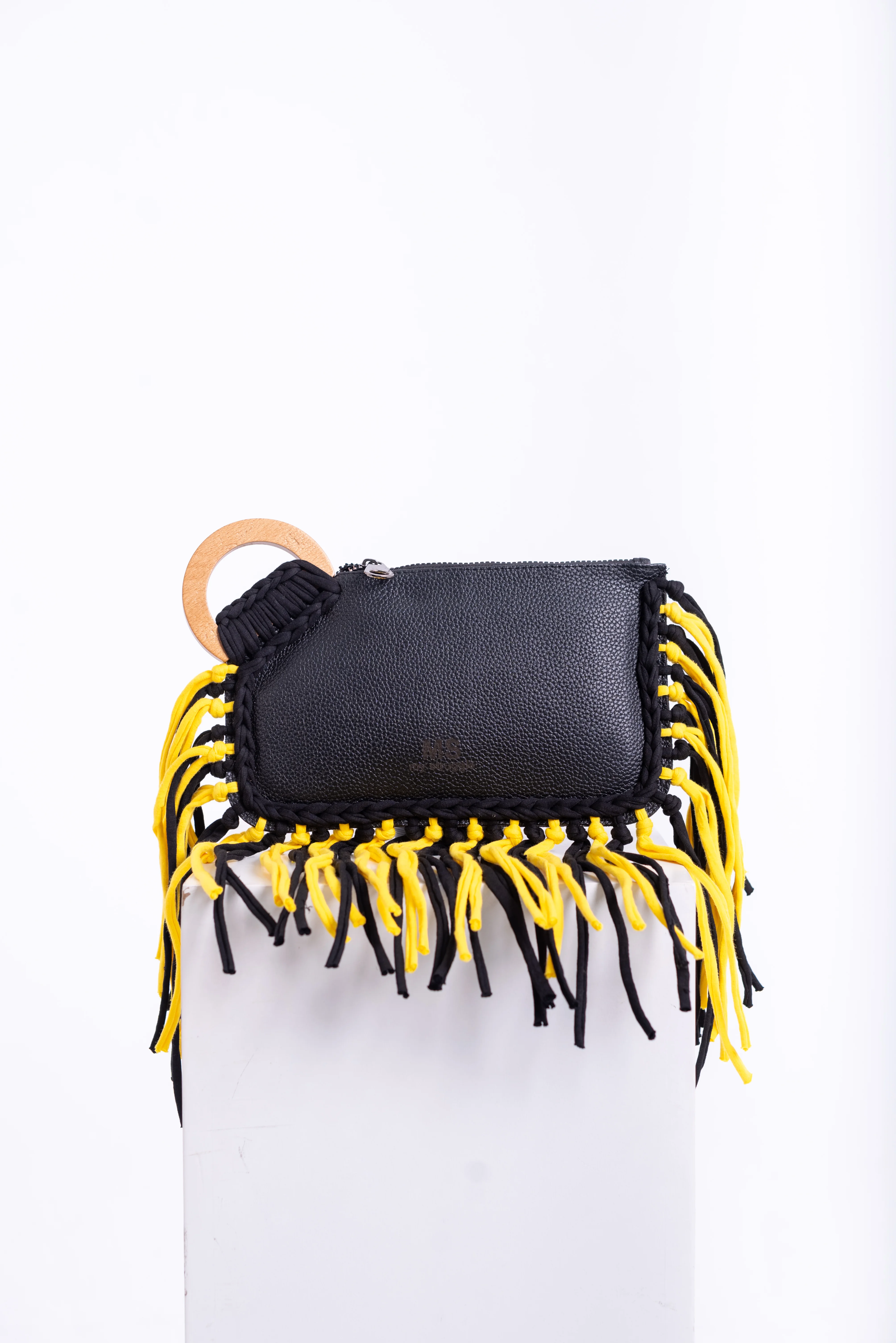My Struggle Black & Yellow Leather Fringe Clutch.