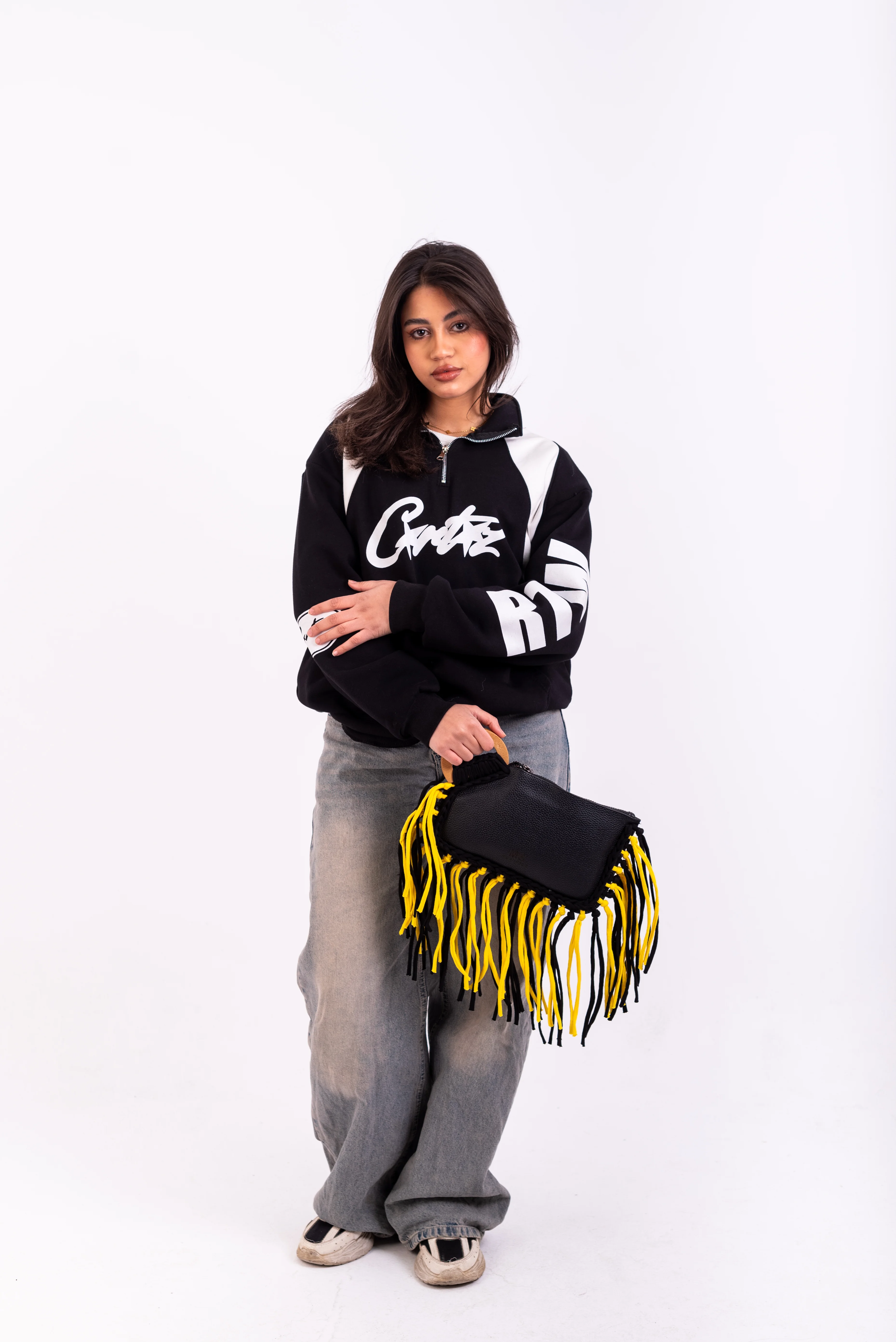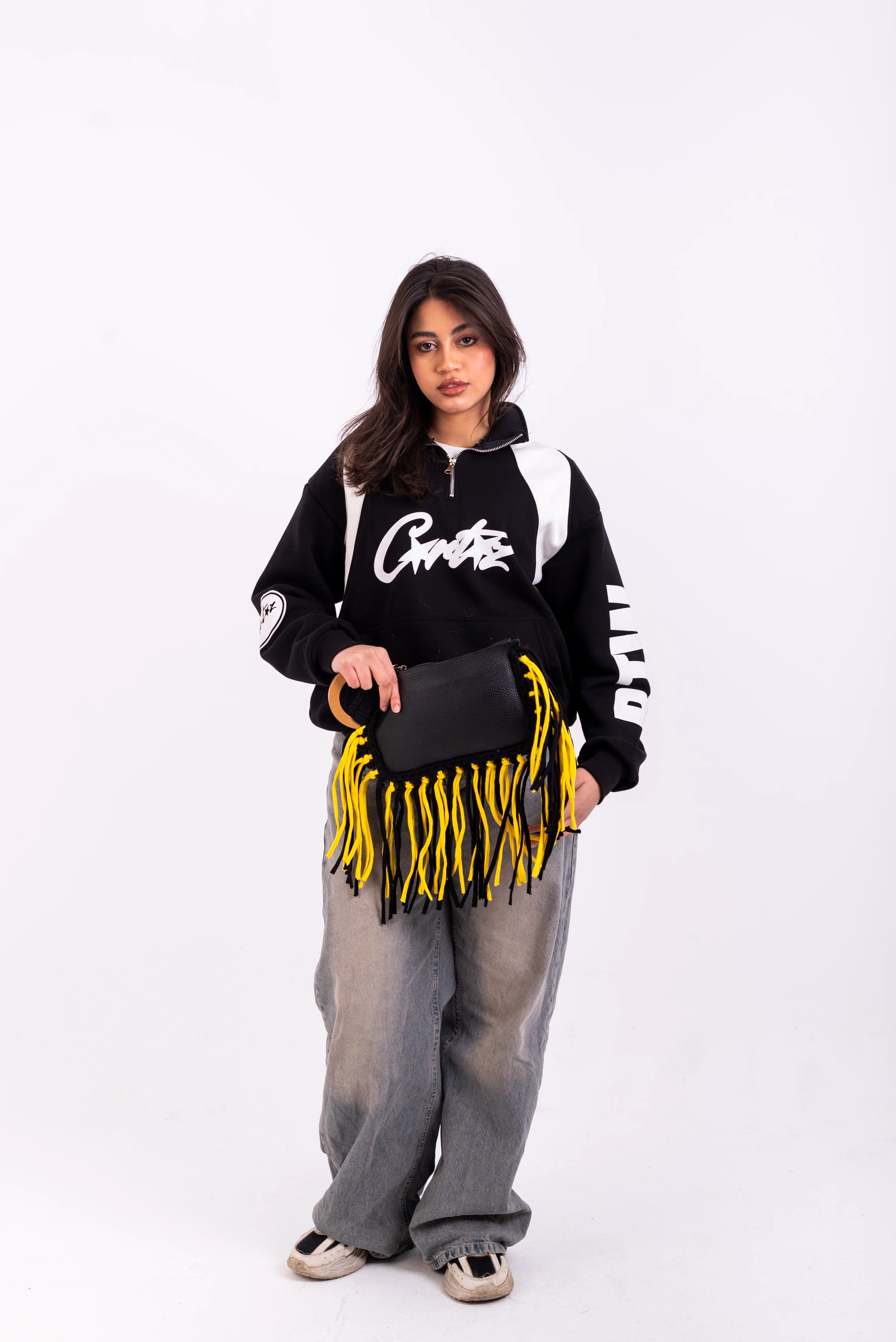 Color: Features a sleek Black main body beautifully contrasted with eye-catching Black & Yellow Fringe Detailing, creating a dynamic and modern aesthetic.