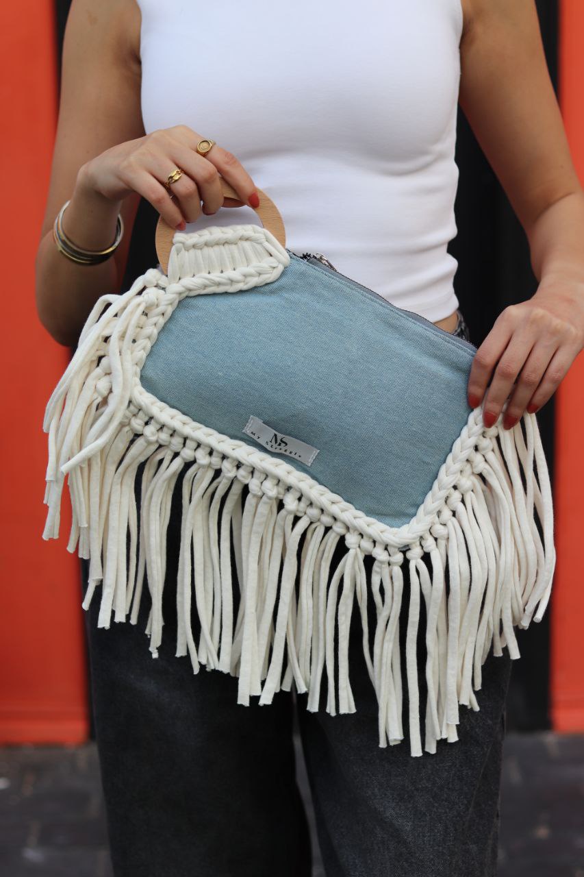 My Struggle Denim & Macramé Fringe Clutch. A versatile women's premium clutch with casual light blue denim and unique white macrame fringe. Shop boho clutches!