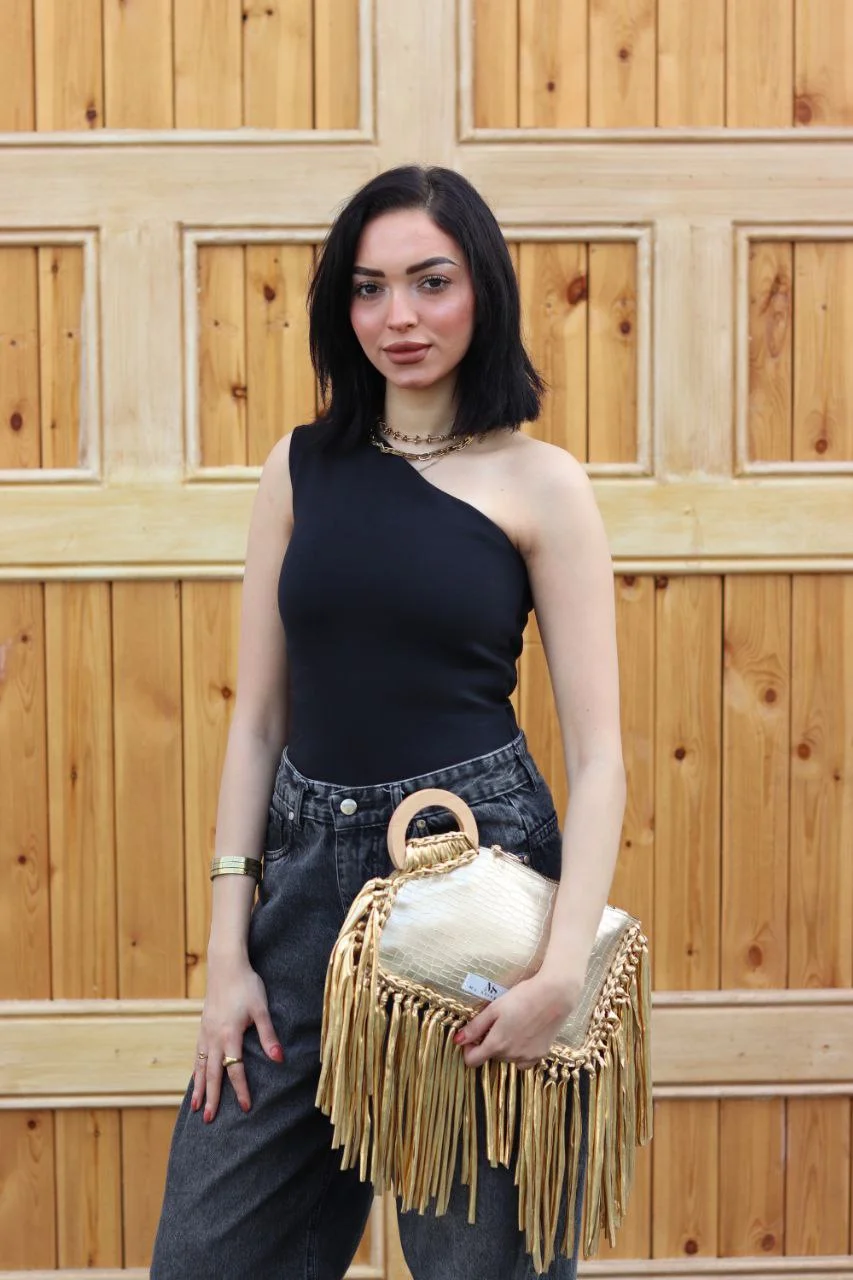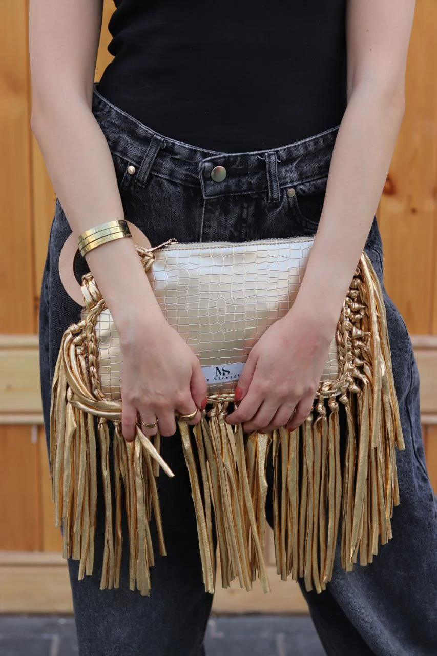 My Struggle Golden Glam Fringe Clutch. A stunning women's premium clutch with a radiant gold finish and versatile carrying options. Shop captivating clutches