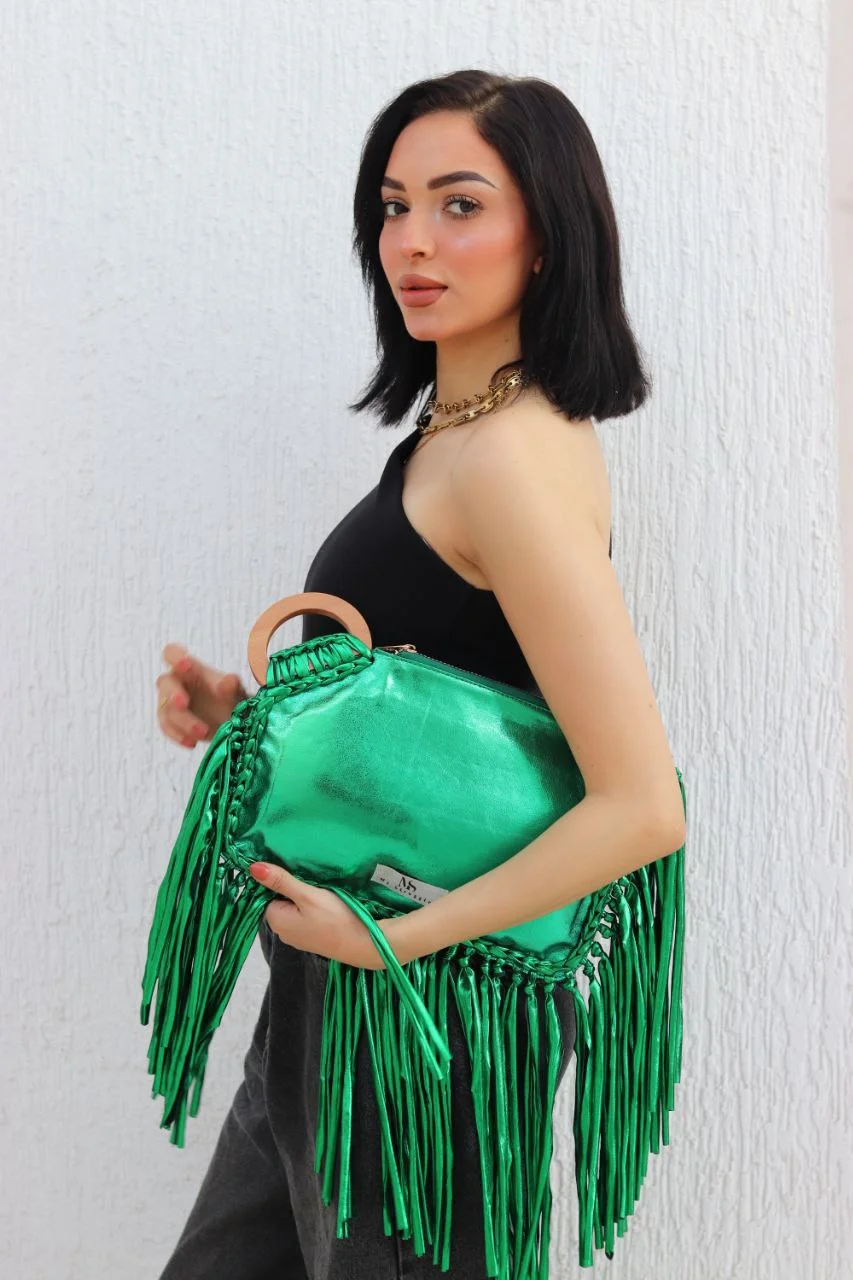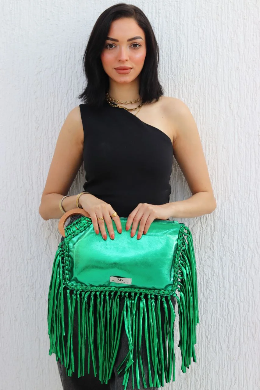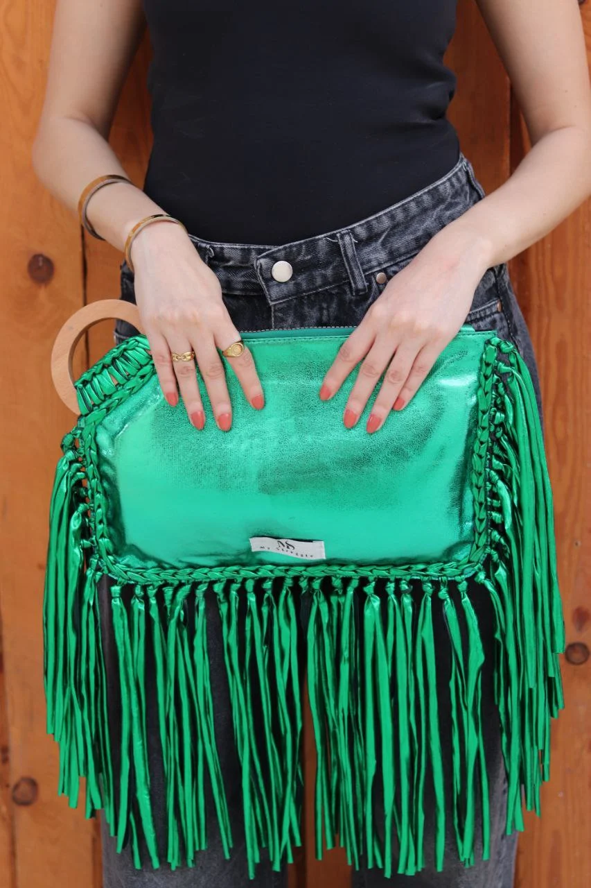 My Struggle's The Emerald Eclipse premium metallic clutch. This vibrant green women's bag features a lustrous finish & unique wooden handle. green bag for women