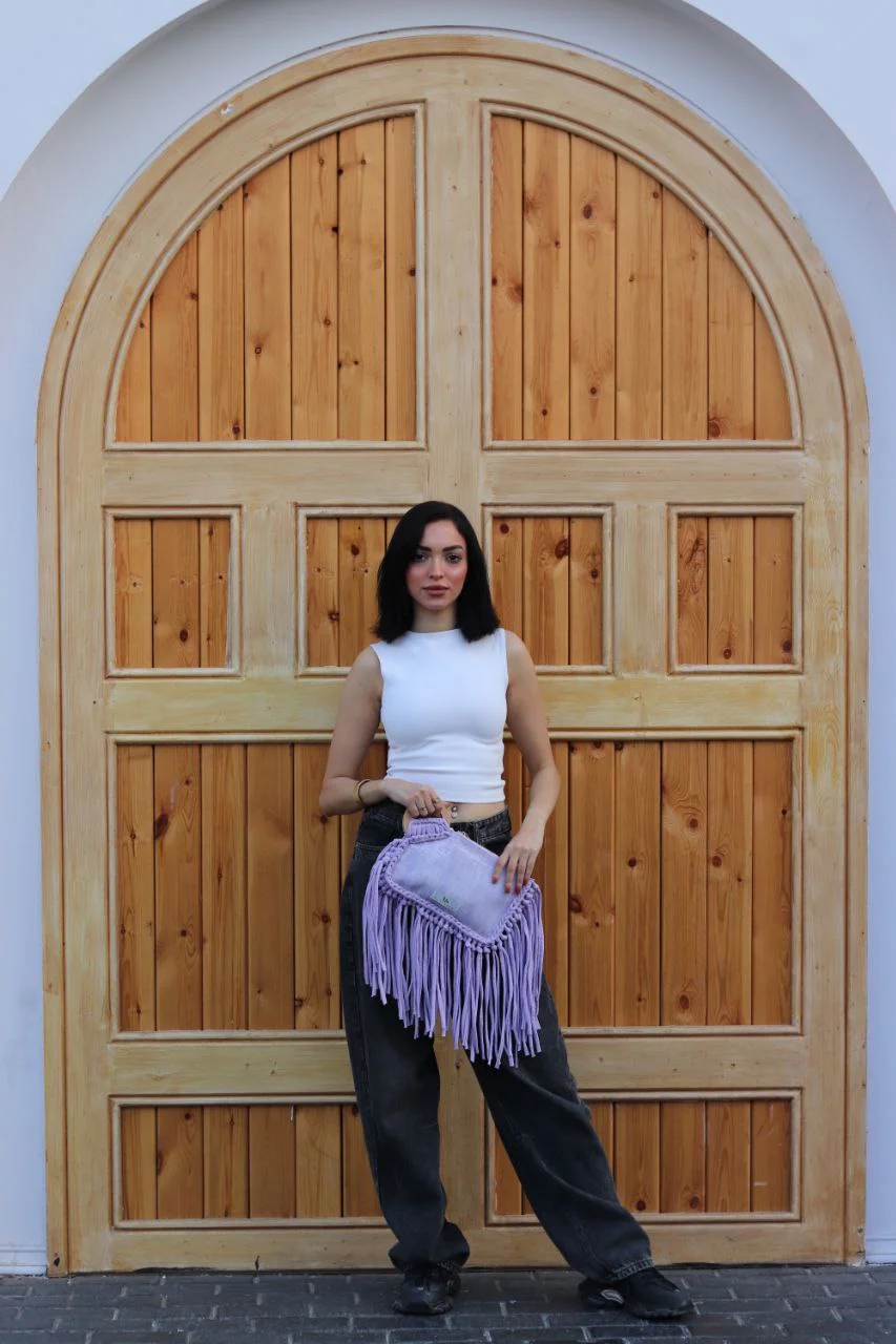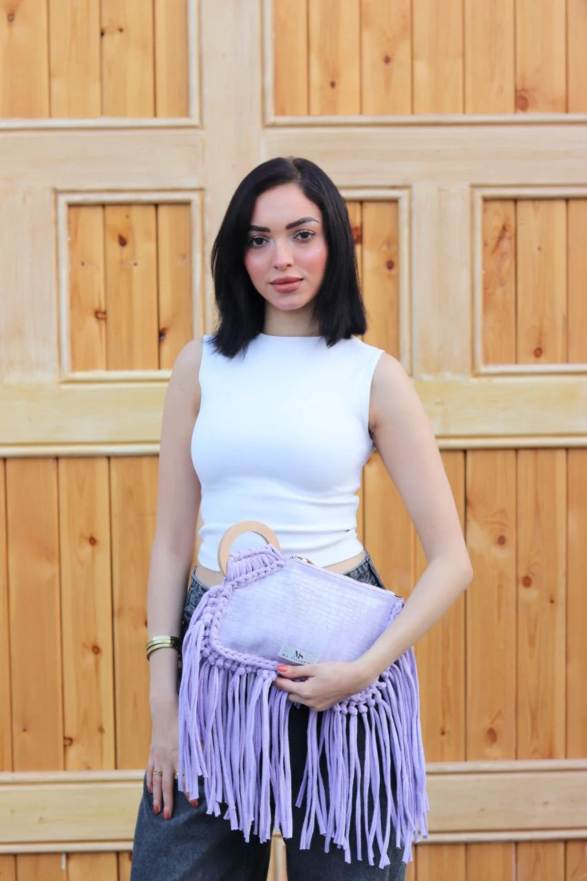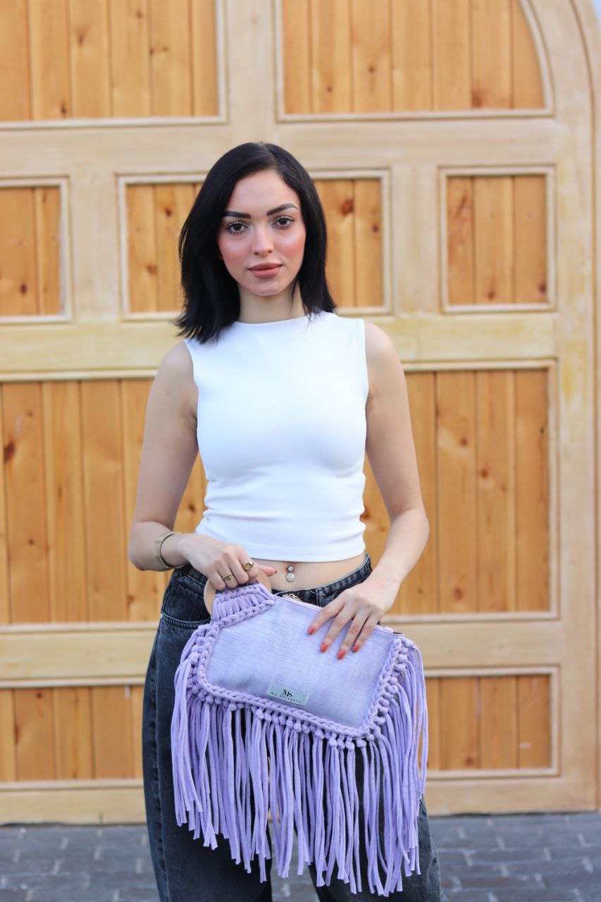 Flowing Matching Fringe: Adorned with a lavish cascade of soft lavender fringe that perfectly complements the clutch's body, creating graceful movement and enhancing its contemporary bohemian aesthetic.