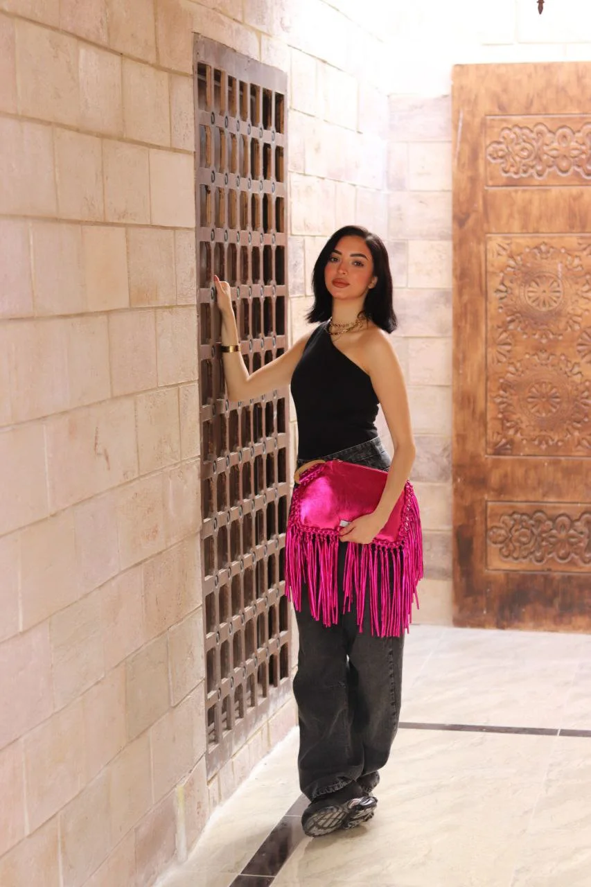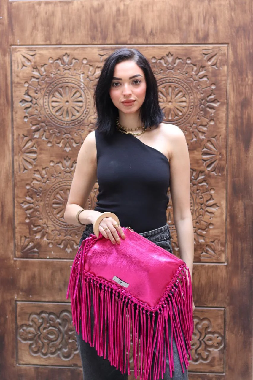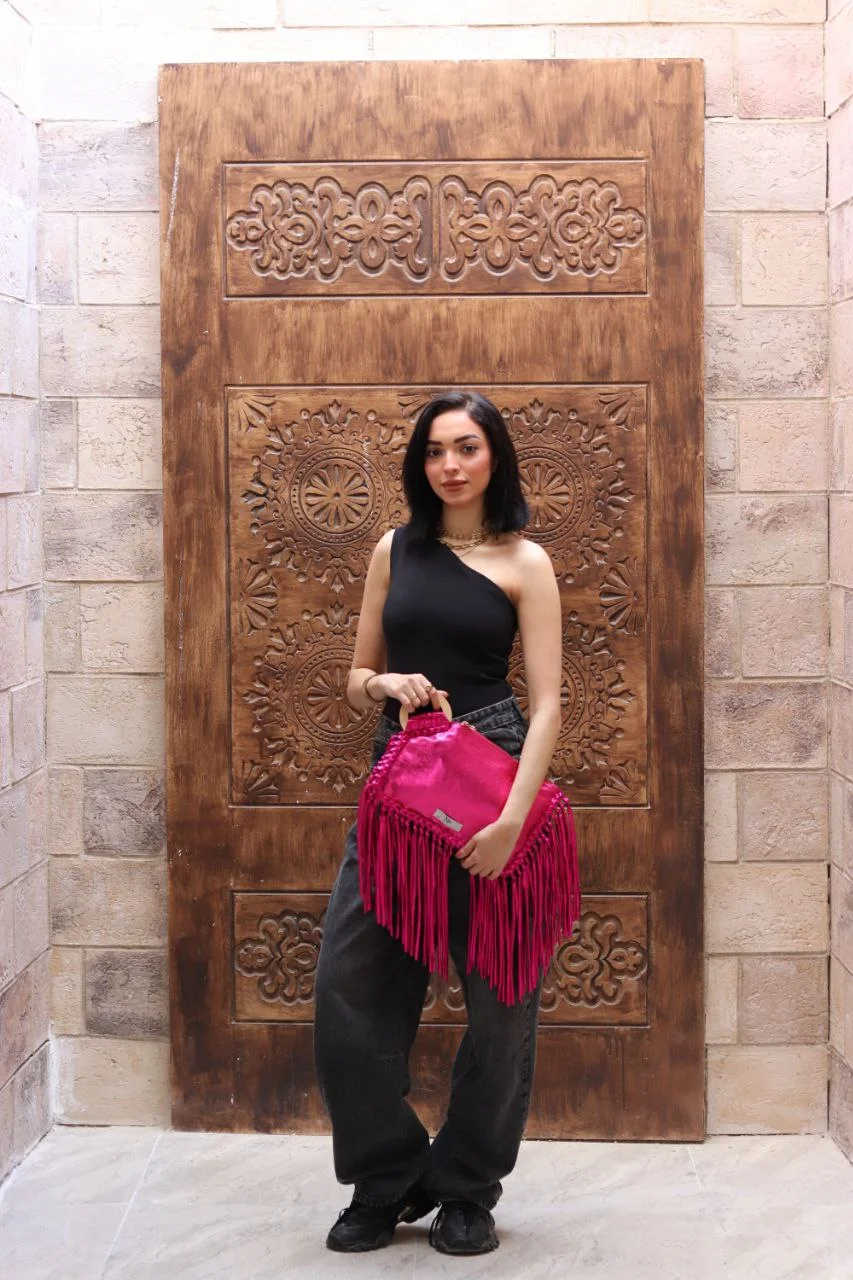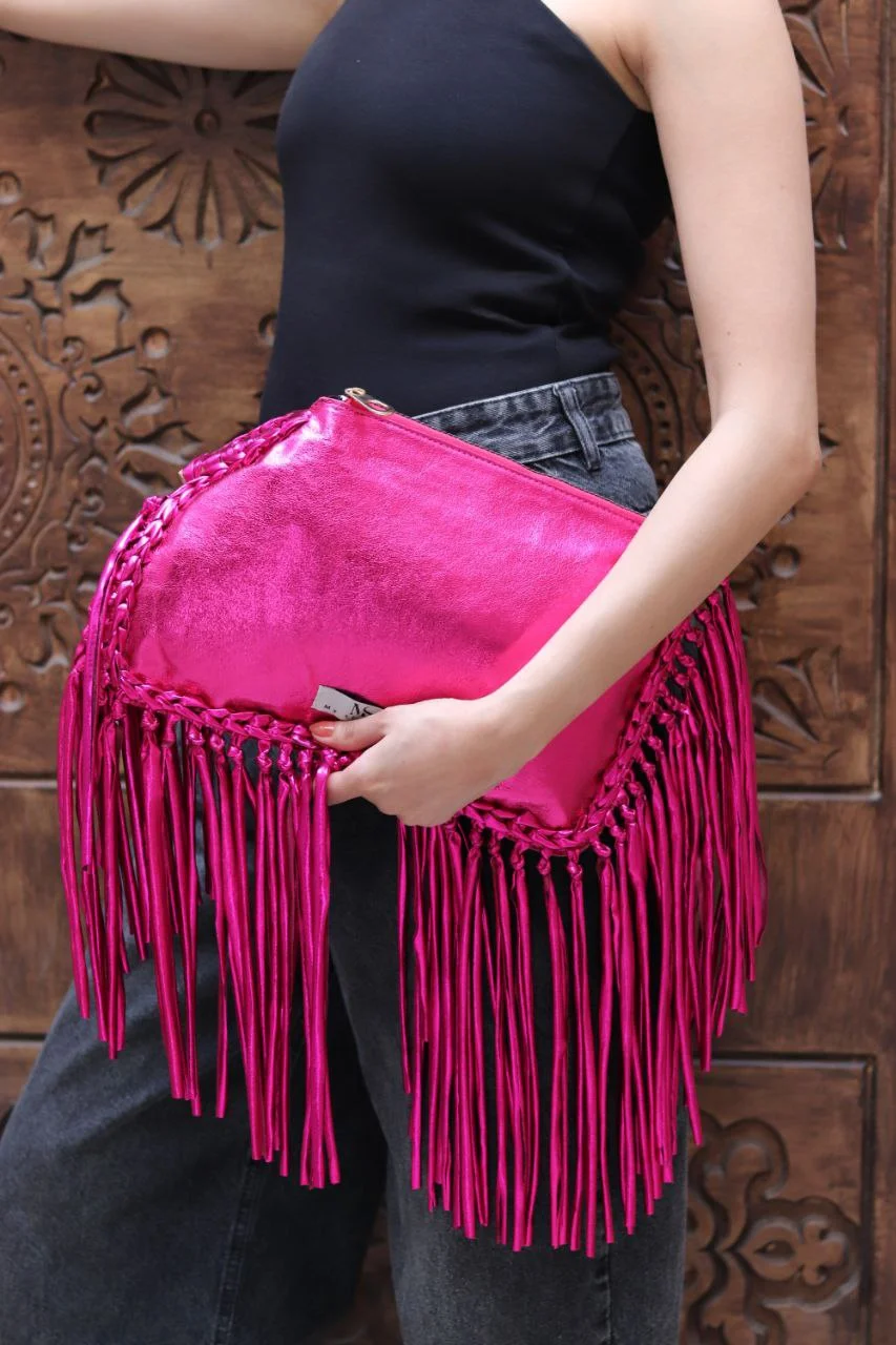 My Struggle Hot Pink Metallic Fringe Clutch. A bold women's premium clutch with a vibrant fuchsia finish and dynamic fringe. Shop unique clutches!