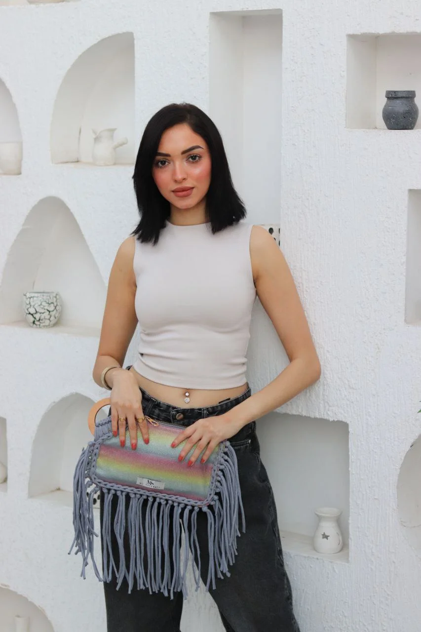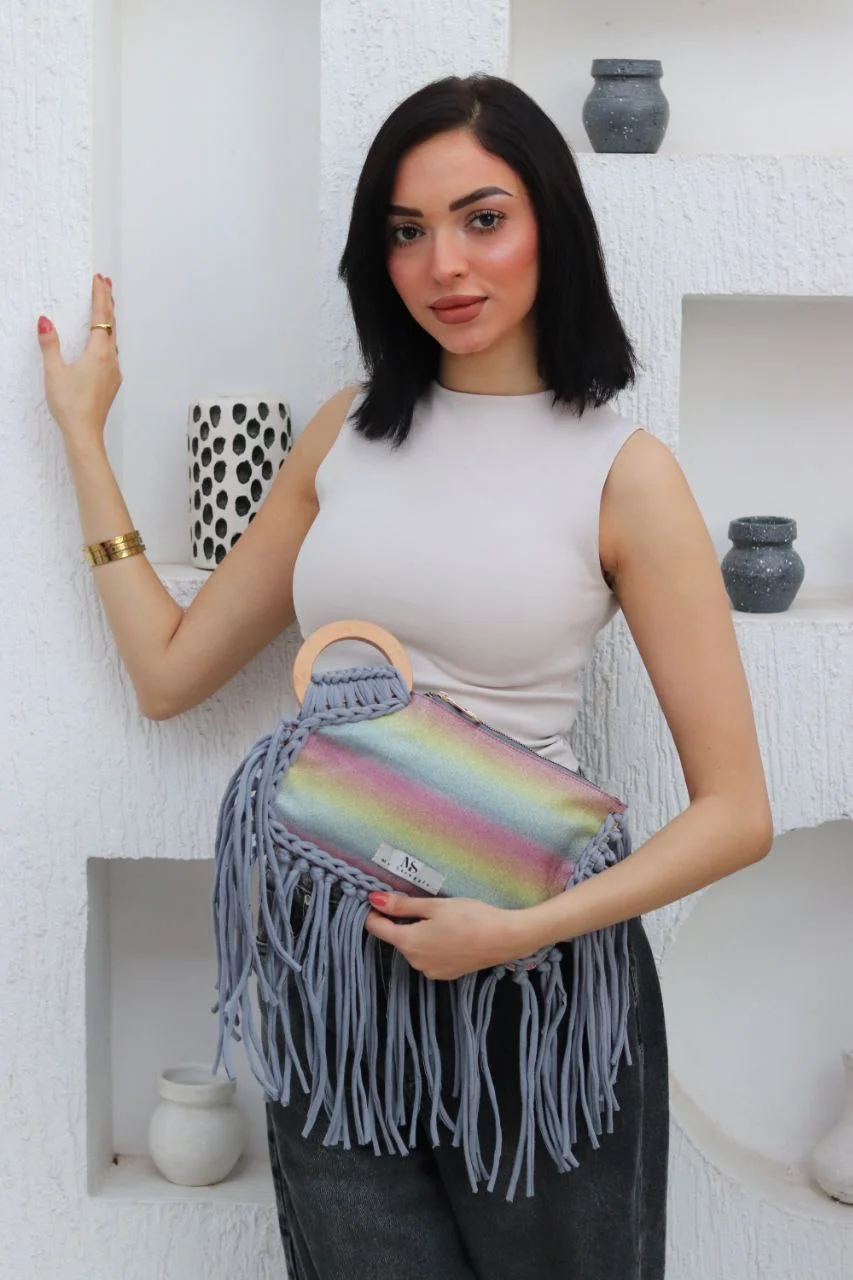 My Struggle Rainbow Glitter Fringe Clutch. A unique women's premium clutch featuring dazzling multi-color glitter & elegant grey fringe. Shop whimsical clutches